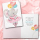 Here's a cute birthday card for any child! The front features a gray elephant dressed up in a pink tutu and ballet slippers. She holds a string with three brightly colored balloons. The inside of the card has text fields in gray and teal for you to customize or leave as is. It also has a second image of the balloons.