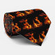 This tie depicts the energy of fire in a wood burning stove. A repeating abstract pattern of orange, gold and yellow flames appear as joyful dancing characters. They are set off by a black background.