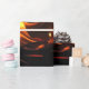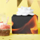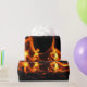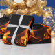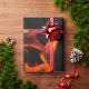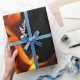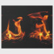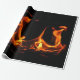 This wrapping paper depicts the energy of fire in a wood burning stove. The orange, gold and yellow flames appear as joyful dancing characters. They are set off by a black background.