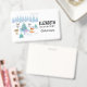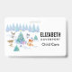 Name badge with a whimsical Christmas scene. Happy forest animals dancing around a decorated Christmas tree.