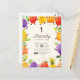 This design is part of the 'Dancing Fruit' kids' birthday party collection. It features cute stationery with watercolor tropical fruits such as papaya, grapes, strawberries, oranges, and pineapples together with leaves and musical notes. Perfect for a boy or girl child’s birthday celebrations.