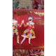 Two debonair harlequin dancers gracefully perform in vibrant costumes against a regal cranberry-red backdrop, adorned with decorative golden garlands and surrounded by delicate musical notes. Original illustration by Noël Snow.