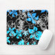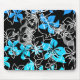 Tropical vintage print inspired by the aloha shirts of the sixties and the seventies. A colorful blend of blues transitions through the hibiscus flowers on a background of black, gray & white. These designs come in several colorways.