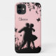 Great silhouette of wild flowers cover this pink and silver case with butterflies flitting about on the front and sides. A man and woman is dancing