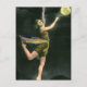 Fun vintage photo of a young woman seemingly dancing in air pointing toward the full moon at the top right. She's wearing a green pair of shorts and top with a striped ribbon around the waist
