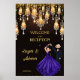 Gold sparkling chandeliers Indian wedding reception editable template welcome sign poster instant digital download. Dancing cute bridal couple, gold glitter.