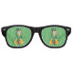 Sunglasses with an Illustration of a smiling happily dancing leprechaun wearing a green suit, a bow-tie, and a bowler hat; with black notes and a yellow and orange rainbow in green background.