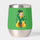 Wine Tumbler with an Illustration of a smiling happily dancing leprechaun wearing a green suit, a bow-tie, and a bowler hat; with black notes and a yellow and orange rainbow in green background.