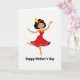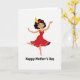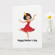 At the center of the card is a cheerful animated woman caught mid-dance on a bright white background, her lifted leg and open arms giving the scene a friendly, affectionate energy ❤️. She wears a deep red knee-length dress with small white circles along the hem, and her posture feels like she’s twirling toward someone she cares about. Her dark hair is neatly styled and topped with a red headband holding a golden feather, adding a festive touch. A simple gold beaded necklace rests at her collar, echoing the warm yellow accents elsewhere in the design 🌼. Beneath the figure, the words “Happy Mother’s Day” appear in clear lettering, centered near the bottom in a dark tone that stands out against the white space. The limited palette of red, yellow, and white keeps the focus on her bright smile, rosy cheeks, and shining eyes. The skirt flares slightly as if caught in motion, with the dotted trim curving along the lower edge.