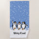 Dancing Penguins Design Beach Towel with customizable background color and text.