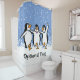 Dancing Penguins Design Shower Curtain with customizable background color and text.