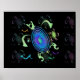 A dancing sea turtle with a deep blue spiral shell surrounded by multicolored abstract waves. A unique sea turtle design.