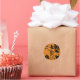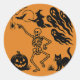 Halloween sticker featuring a dancing skeleton, black cat, jack-o’-lantern, witch, bats, ghosts, and spider on an orange background. Perfect for decorating party favors, scrapbooks, or gifts