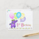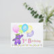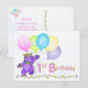A purple teddy bear princess dressed up in a lovely yellow jeweled crown and pink, blue and green flowers is dancing through the flowers and holding a bunch of colorful balloons with the word HAPPY on them. This happy birthday postcard will bring a smile to a special girl on her 1st birthday. Personalize with her name to make it extra special. Original design by Anura Design Studio.