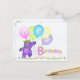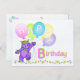 A purple teddy bear princess dressed up in a lovely yellow jeweled crown and pink, blue and green flowers is dancing through the flowers and holding a bunch of colorful balloons with the word HAPPY on them. This happy birthday postcard will bring a smile to a special girl on her birthday. Original design by Anura Design Studio.