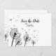 Black and white save the date card with pretty Dandelion Puffs with its seeds blowing in the wind. Background color can be changed to suit you. Personalize with your text to create the perfect poscard for your special day.