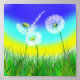 Pictured are painted Dandelions weeds with the seeds blowing in the wind