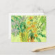 Postcard featuring delicate floral artwork in yellow and green shades, blooming dandelion flowers in clay pitcher and bird cherry branch in glass vase. Life drawing from artist's sketchbook, mixed media - tissue paper collage and ink pen sketch.