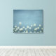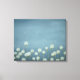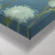 Dandelions Going To Seed is a design on stretched canvas. The colors are blues and white, with dandelion seeds flying above the flowers...
