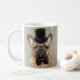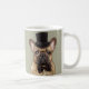 Cute illustration of a hipster style fawn french bulldog puppy puppy wearing eye glass, top hat and chic bow tie on grey background. Designed by Maryline Cazenave.