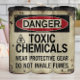 This distressed vintage-style warning sign prominently features "DANGER." in a bold red and black banner. Below, a hazard symbol accompanies "TOXIC CHEMICALS" in stark lettering. The sign further instructs "WEAR PROTECTIVE GEAR" and "DO NOT INHALE FUMES," all set against a weathered, rusty background, emphasizing critical safety precautions.