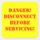 These square stickers have "Danger! Disconnect Before Servicing!". These warning labels are colored for high visibility. Just peel and stick. The label text can be changed to any text or message desired. More label designs are offered.