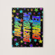 This fun, lively, birthday-themed jigsaw puzzle design features the message "HAPPY BIRTHDAY, DANIEL" with the characters having a colorful rainbow spectrum inspired gradient pattern, in addition to a vibrant star field background pattern. An exciting puzzle like this might be used to send a birthday greeting message to somebody named Daniel. [~Z0000468]