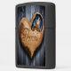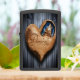 A wooden heart carved with the name Daniel, featuring a wolf howling at the moon inside a carved-out section.