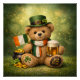 This adorable St. Patrick’s Day design features a soft, photorealistic teddy bear dressed in a classic green top hat and Irish tricolour scarf, proudly holding a flag and a frothy pint, surrounded by shamrocks and pots of gold. Set against a rich green background with warm golden tones, it captures the fun, cozy spirit of the celebration perfectly.