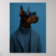 This striking, surreal portrait features a regal Doberman wearing a stylish blue coat, matching turtleneck, and chic sunglasses against a deep monochromatic background. The artwork blends animal portraiture with a sense of high-fashion, humor, and sophistication. With its deep blue aesthetic and minimalist composition, it is the perfect statement piece to add personality, wit, and elegance to any modern living room, hallway, man cave, or creative office space.