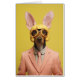 A stylish dachshund dressed for Easter in a pastel pink suit, striped tie, and yellow bunny-eared helmet, exuding charm and whimsy against a bright yellow background. A perfect blend of elegance and humor for a festive Easter celebration.