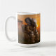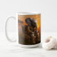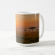 A large white coffee mug featuring a humorous and detailed image of a handsome elephant in a tweed suit seated regally in a luxurious armchair at sunset.