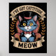 This charming and humorous graphic features a sophisticated blue and black cartoon cat, seated regally in a plush red armchair. The cat, with piercing yellow eyes and a content expression, is adorned with a stylish black top hat and a dapper red bow tie. Above, a banner proudly proclaims, "I'VE GOT CATTITUDE," while another banner below simply states "MEOW." Laurel wreaths frame the scene, all set against a solid black background. Digital download for personal