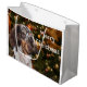 Cute long haired dappled or spotted dachshund in front of a Christmas tree with somewhat matching colors dog lovers Christmas holiday large gift bag