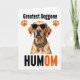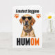 Designed with a golden-toned dog shown from the chest up, centered against a bright white background, this card keeps the focus on a loyal companion with a tender, friendly presence ❤️. The fur is shaded in soft honey and tawny gradients, giving the illustration depth and a gentle glow. Dark sunglasses sit across the dog’s face, and their speckled pattern matches a stylish collar, adding a fun, affectionate twist. A small shiny tag hangs from the collar, catching the eye like a little keepsake from someone who adores their pet. Across the top, dark uppercase text reads “Greatest Doggone,” with two orange paw-print shapes placed to the left and right like cheerful accents 🌼. Near the bottom, the word “HUMOM” appears in thick lettering, mixing black with a punch of orange for contrast. The wide white space around everything makes the warm dog colors and the orange details stand out clearly, while the sunglasses give the pup a cool, companionable look. The orange paw prints sit on either side of the top line, and the bottom word is centered beneath the dog’s neck.