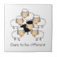 Funny black sheep tile. A group of white sheep with pink faces and grey ears are surrounding a woolly black sheep, also with a pink face and grey ears. Below is a caption "dare to be different" in black lettering.