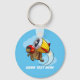 A keychain or key ring featuring a cartoon adrenaline junkie tortoise in a crash helmet, swooping through the clouds with a large jet engine strapped to his back. A dynamic, upbeat image, drawn for fun. It could be about not accepting the limitations life hands to you; a cute cartoon for lovers of extreme sports; or an image for tortoise owners and enthusiasts. Change the default text to your own message or caption.