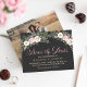 Our vintage boho floral wedding photo save the date cards feature a moody floral arrangement of romantic roses, peony and anemone flowers, greenery, and rustic bohemian feather accents in rich shades of dusty rose, mauve pink, cassis, creamy white, moss green, gray, and gold on a dark gray / black background color. A dramatic and dreamy color scheme for your fall or winter wedding. Personalize the photo and beautiful custom text for your elegant rustic wedding day.