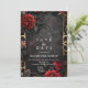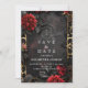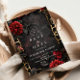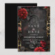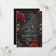 Immerse your guests in an atmosphere of gothic opulence with this baroque floral wedding design. Deep crimson dahlias, ornate gold scrollwork, and vintage black textures frame your personalized text in dramatic elegance. Ideal for Halloween weddings, victorian themes, or moody romantic events, this design sets the tone for an unforgettable celebration steeped in mystery and style.