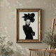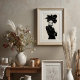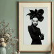 Make a striking statement with this captivating black and white art print, a true masterpiece of avant-garde fashion and artistic expression. This compelling frontal portrait features a woman of intense allure, crowned with an extraordinary, sculptural black hat that unfolds like a dramatic, dark blossom. Dressed in a sleek black turtleneck, complete with elegant leather gloves and shimmering silver bracelets on one wrist, her attire is a study in sophisticated minimalism. Her pale skin, stark black lips, and dramatically winged eyes create a mesmerizing contrast against her dark ensemble and the pristine white background, emphasizing her powerful and direct gaze. With arms confidently crossed, this artwork embodies a fierce, mysterious, and undeniably chic elegance. Perfect for modern living spaces, fashion studios, or any decor seeking a touch of unique sophistication, bold artistry, and a truly unforgettable visual narrative.