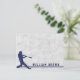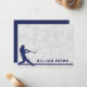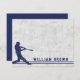 Personalized notecard featuring a dark blue silhouette of a baseball player swinging a baseball bat on a worn ball background. At the bottom is a border with two blue stripes and customizable name or other text in a dark blue college jersey sports font.