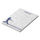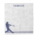 Personalized notepad featuring a dark blue silhouette of a baseball player swinging a baseball bat on a worn ball background. At the bottom is a border with two blue stripes. Customizable name or other text in a dark blue college jersey sports font.