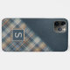 Contemporary tan, brown, beige, taupe, and dark teal blue tartan plaid, and a faux leather texture pattern background. With room to customize or personalize with a name monogram or initial of your choice. Beautiful, modern, and cool cover for the trend-savvy and art-loving hip trendsetter, artsy motif lover who wants to protect their phone from dust and dirt, wear and tear. This design is available for Apple iPhone 6, 7, and 8 Plus, 10 or X, XR, XS, 11, 12, 13 Mini, 14, 15 Plus, and Pro Max cellphone cases. Show off your style, look fashionable, and feel stylish with a unique design on a mobile device accessory of your choice.