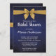 Plain white envelopes are included with paper invitations and will come to fit the invitation size you select. If you don’t need the envelopes, you may choose to not receive them by selecting the dropdown below "Envelopes" and choosing "None." If you’d like to have a design on your envelopes, you can browse all of these available envelopes to find the design that complements your Dark Blue Gold Bow Shower Invitation.