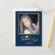 A simple graduate thank you postcard with a square photo accented with faux gold glitter border on a dark blue background. The design offers gold handwritten style text. The backside offers custom text for your own personal thank you message.