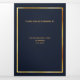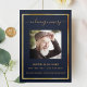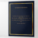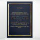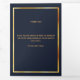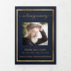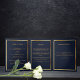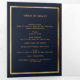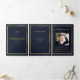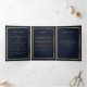 An elegant tri-fold program. A dark blue background, a faux gold frame and space for your photo. Personalize and add name, dates and your text.