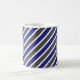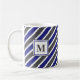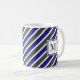 Diagonal striped pattern coffee mug in white, dark blue and gray with monograms on both sides in matching colors.