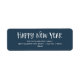 These colorful return address labels say "Happy New Year" on a blue background, with whimsical modern white typography.