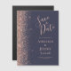 The left-hand edge of this elegant save the date magnetic card features a rose gold faux glitter border. The customizable text combines pale rose gold blush colored handwriting, copperplate and italic fonts on a dark blue background.