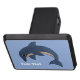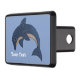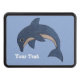 This trailer hitch is light blue with a sparkle like jumping dolphin who is dark blue with a white stomach and has a black and white swirl eye. Customize your text with the template.